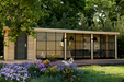 The PSL1 summerhouse features the licensed Pro system, blending sleek modern design with long-lasting strength. Its sliding glass wall with a steel-effect finish creates a striking, contemporary look, while Nordic larch wood provides both elegance and resilience.